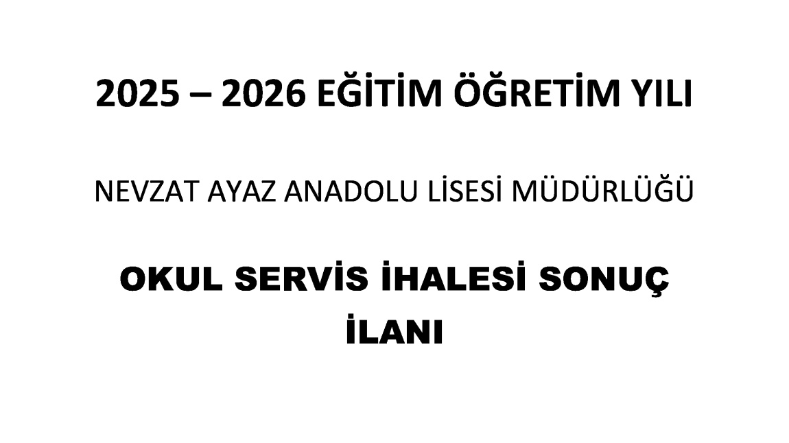Milli Eğitim Bakanlığı’nın 25.10.2017 Tarih ve 30221 Sayılı Resmi Gazete’de yayımlanan Okul Servis Araçları Yönetmeliğinin 8 Maddesinin 6. Fıkrasına göre hazırlanan 06.07.2018 Tarihinde Okul Servis Araçlarının Çalıştırmasına İlişkin Usul ve Esaslara uygun bir şekilde iş/işlemler yapılmış olup “Nevzat Ayaz Anadolu Lisesi 2025-2026, 2026-2027 ile 2027-2028 Eğitim Öğretim Yılları Üç Yıllık Öğrenci Taşıma İşi’ni CİHAN TURİZM-Dilek CİHAN adlı firma yapmaya hak kazanmıştır. Tüm öğrenci taşıma işinin bu kişi/firma ile yapılması hususunda velilerimize ve kamuoyuna duyurulur.